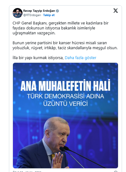Cumhurbaşkanı Erdoğan sosyal medya hesabından yaptığı paylaşımda, "CHP Genel Başkanı, gerçekten millete ve kadınlara bir faydası dokunsun istiyorsa bakanlık isimleriyle uğraşmaktan vazgeçsin. Bunun yerine partisini bir kanser hücresi misali saran yolsuzluk, rüşvet, irtikâp, taciz skandallarıyla meşgul olsun" ifadelerini kullandı.