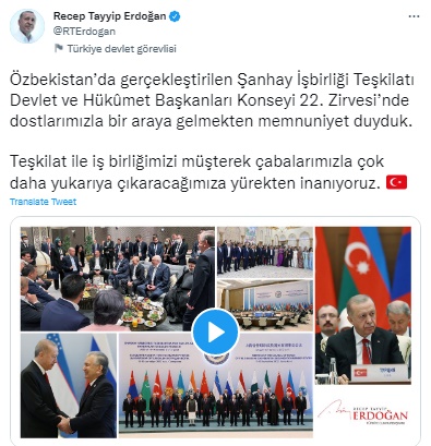 Cumhurbaşkanı Recep Tayyip Erdoğan, Şanghay İşbirliği Örgütü Devlet ve Hükümet Başkanları Konseyi 22. Zirvesi ile ilgili paylaşımda bulundu.