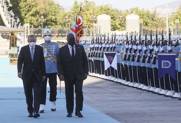 Başkan Erdoğan, Tshisekedi'yi Cumhurbaşkanlığı Külliyesi'nin ana giriş kapısında karşıladı. Erdoğan ve Tshisekedi'nin tören alanındaki yerlerini almalarının ardından, 21 pare top atışı eşliğinde iki ülkenin milli marşları çalındı.