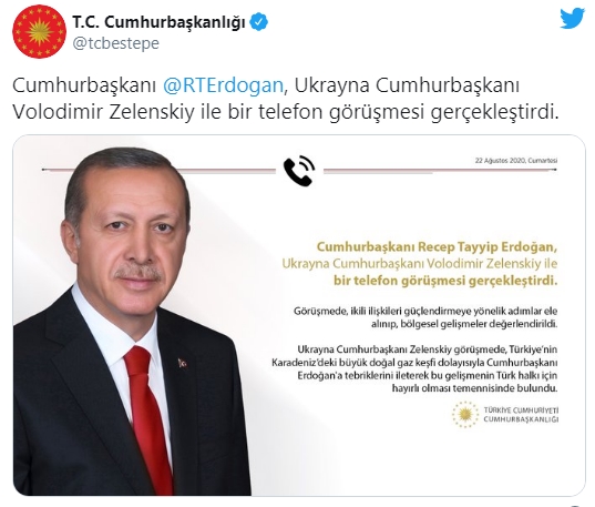 Zelenskiy görüşmede, Türkiye'nin Karadeniz'deki büyük doğal gaz keşfi dolayısıyla Cumhurbaşkanı Erdoğan'a tebriklerini ileterek, bu gelişmenin Türk halkı için hayırlı olması temennisinde bulundu.