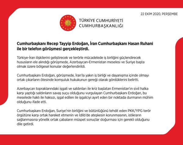 Cumhurbaşkanı Recep Tayyip Erdoğan, İran Cumhurbaşkanı Hasan Ruhani ile telefonda görüştü. Görüşmede Azerbaycan - Ermenistan gerilimi ve Suriye'deki son durum ele alındı.