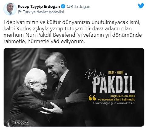Erdoğan, Twitter hesabından yaptığı paylaşımda, "Edebiyatımızın ve kültür dünyamızın unutulmayacak ismi, kalbi Kudüs aşkıyla yanıp tutuşan bir dava adamı olan merhum Nuri Pakdil Beyefendi'yi vefatının yıl dönümünde rahmetle, hürmetle yad ediyorum" ifadesini kullandı.