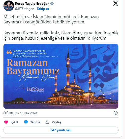 Cumhurbaşkanı Recep Tayyip Erdoğan Ramazan Bayramı dolayısıyla sosyal medya hesabından bir paylaşım yaptı.