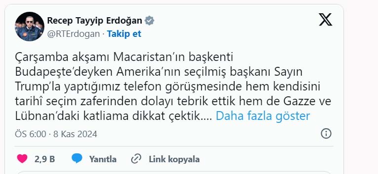 Çarşamba akşamı Macaristan’ın başkenti Budapeşte’deyken Amerika’nın seçilmiş başkanı Sayın Trump’la yaptığımız telefon görüşmesinde hem kendisini tarihî seçim zaferinden dolayı tebrik ettik hem de Gazze ve Lübnan’daki katliama dikkat çektik.