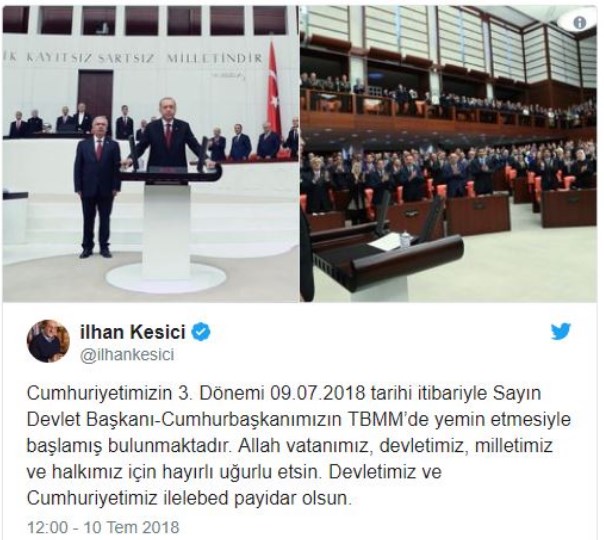 CHP İstanbul Milletvekili İlhan Kesici, Başkan Erdoğan'ın Meclis'te yemin ederken ki fotoğrafını Twitter'dan paylaşıp "Cumhuriyetimizin 3. Dönemi 09.07.2018 tarihi itibariyle Sayın Devlet Başkanı-Cumhurbaşkanımızın TBMM'de yemin etmesiyle başlamış bulunmaktadır. Allah vatanımız, devletimiz, milletimiz ve halkımız için hayırlı uğurlu etsin. Devletimiz ve Cumhuriyetimiz ilelebed payidar olsun." dedi.