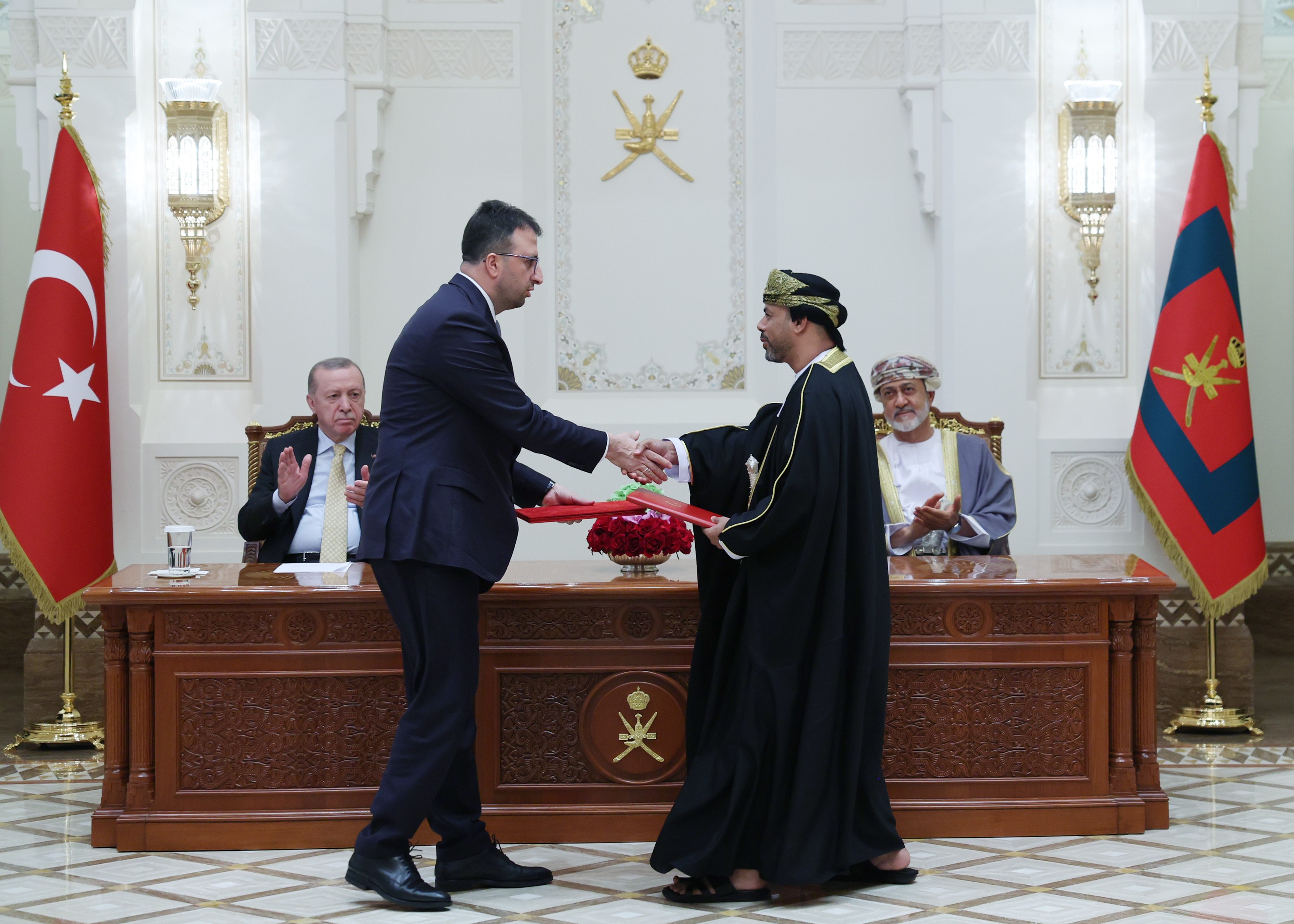 Cumhurbaşkanı Recep Tayyip Erdoğan ile Umman Sultanı Heysem bin Tarık'ın, Al Alam Sarayı'nda başkanlık ettiği heyetler arası görüşmenin ardından iki ülke arasındaki anlaşmaların imza törenine geçildi.