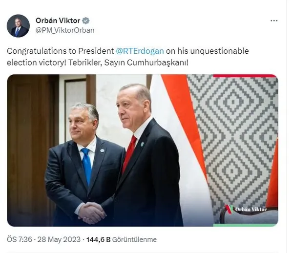 Macaristan Devlet Başkanı Victor Orban da "Sayın Cumhurbaşkanı Erdoğan'ın tartışmasız seçim zaferini kutluyorum" diye yazdı.
