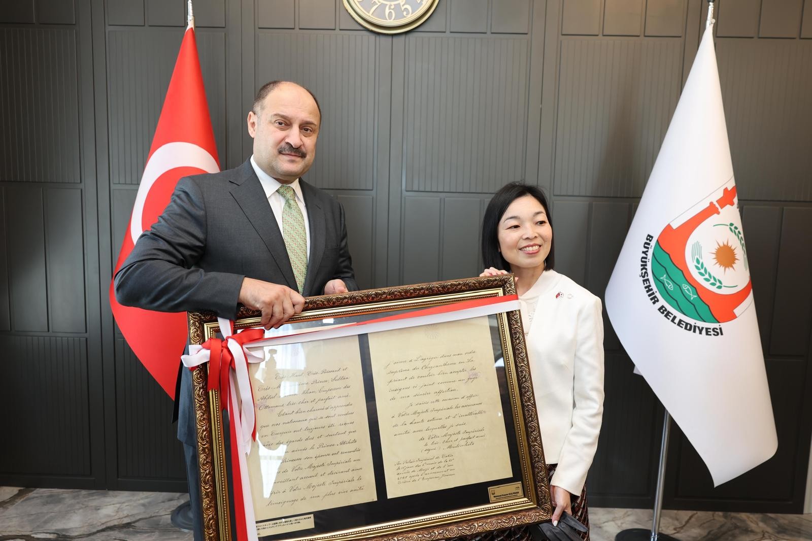 Başkan Gülpınar, Japon İmparatoru Mutsuhito’nun 10 Mayıs 1888 tarihinde Osmanlı Padişahı Sultan II. Abdülhamid’e gönderdiği mektubun replikasını Prenses Akiko’ya takdim ederek, iki ülke arasındaki 137 yıllık diplomatik dostluğu simgeleyen anlamlı bir jestte bulundu.