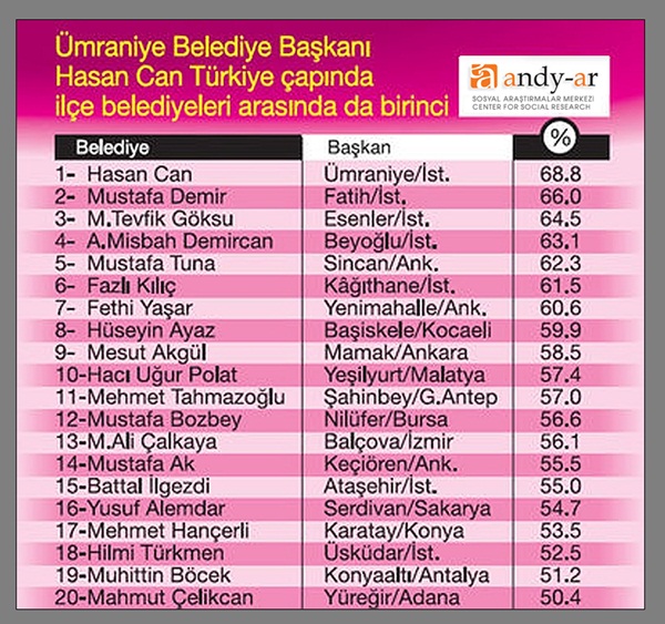 Hizmet memnuniyeti kriterinde, yüzde 68.8 oy oranı ile; ilçe genelinde tanınırlık kriterinde ise, yüzde 89.8 oy oranı ile Ümraniye Belediye Başkanı Hasan Can, Türkiye genelinde ilçe belediyeleri arasında en yüksek oy oranlarını alarak zirveye yerleşti.