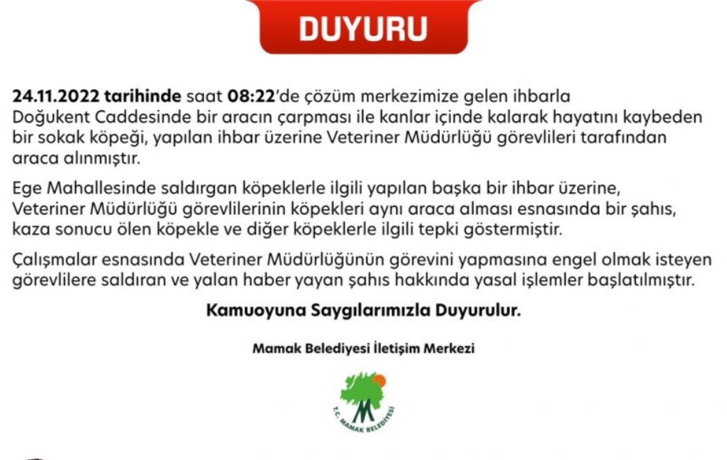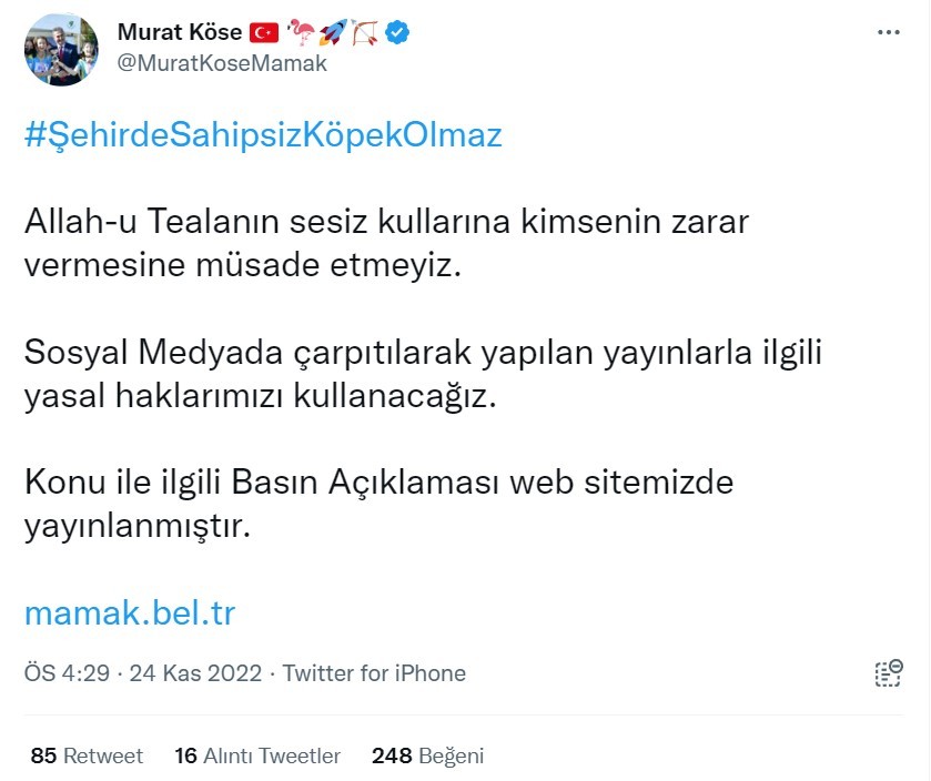 Köpeklerin öldürüldüğü yalanıyla kara propaganda yapan köpekperestlere papuç bırakmayan Başkan Murat Köse, yasal işlem başlatılan duyuruyu da paylaşarak şu ifadelerde bulundu: