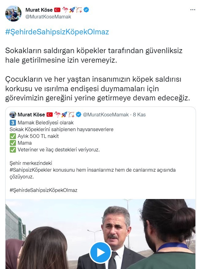 Sosyal medyadan açıklamada bulunan ve "#ŞehirdeSahipsizKöpekOlmaz" etiketini kullanan Başkan Murat Köse, sokakları güvenli hale getireceklerini ifade ederek şunları söyledi: