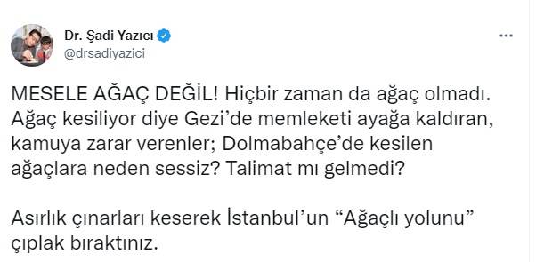 Başkan Yazıcı, sosyal medya üzerinden yaptığı açıklamada, “Ağaç kesiliyor diye Gezi’de memleketi ayağa kaldıran, kamuya zarar verenler; Dolmabahçe’de kesilen ağaçlara neden sessiz. Talimat mı gelmedi? “ ifadelerini kullandı.