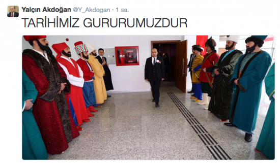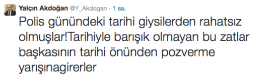 Başbakan Yardımcısı Yalçın Akdoğan, "Polis günündeki tarihi giysilerden rahatsız olmuşlar! Tarihiyle barışık olmayan bu zatlar başkasının tarihi önünden poz verme yarışına girerler" ifadesini kullandı.