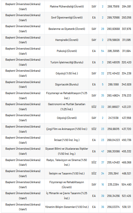 Başkent Üniversitesi 4 yıllık taban puanları 2021, yüzdelik dilimleri ve kontenjan sayıları kaçtır?