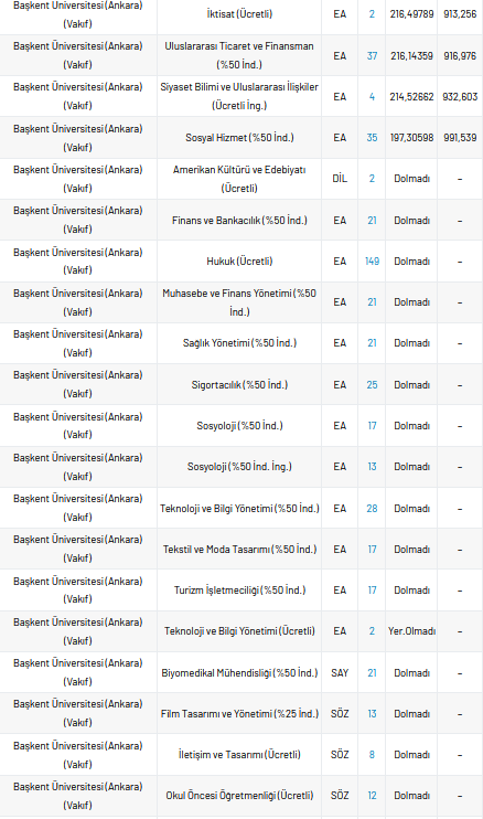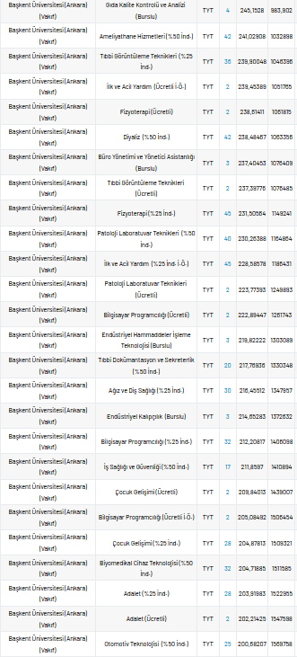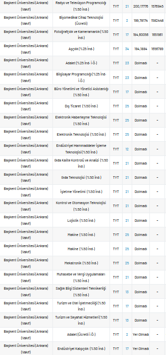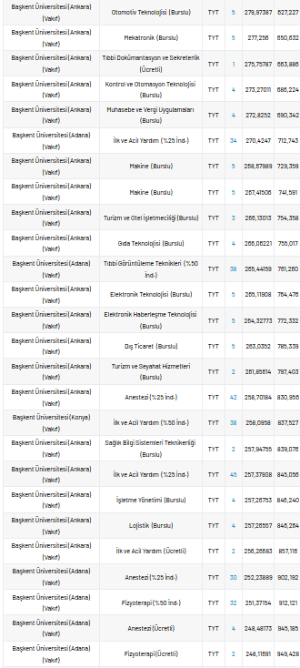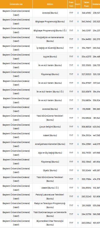 Başkent Üniversitesi 2 yıllık taban puanları 2021, yüzdelik dilimleri ve kontenjan sayıları kaçtır?