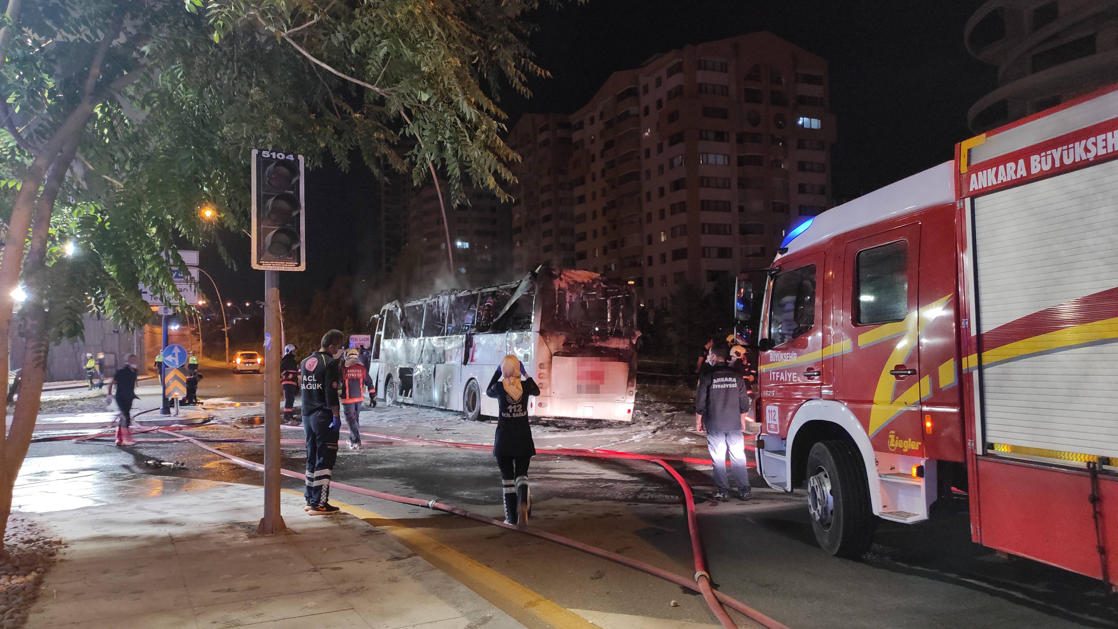 Bodrum-Ankara seferini yapan yolcu otobüsü, Çankaya ilçesi Dumlupınar Bulvarı Çayyolu Kavşağı'nda kontrolden çıkarak aydınlatma direğine çarptı. Çarpmanın etkisiyle sürüklenen otobüs alev aldı.