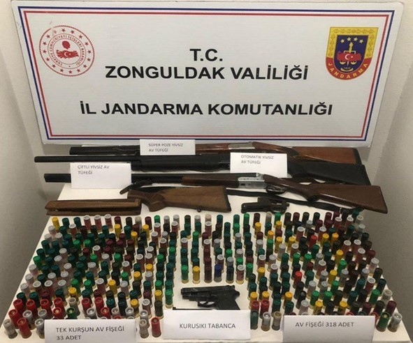 Edinilen bilgiye göre, Zonguldak İl Jandarma Komutanlığı ekiplerince Kdz. Ereğli ilçesinde bir şüphelinin ev ve eklentilerinde yapılan aramada 1 adet satın alma belgesi bulunmayan kurusıkı tabanca, 1 adet kurusıkı tabancaya ait şarjör, 3 adet ruhsatsız av tüfeği, 1 adet tetik tertibatı, 1 adet av tüfeğine ait dipçik, 1 adet av tüfeğine ait el kundağı, 33 adet tek kurşun fişek, 318 adet 12 kalibre fişeği ele geçirildi.