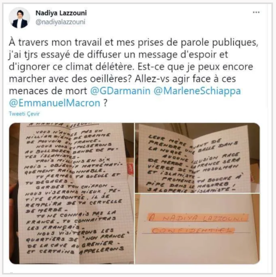 Tehdit mesajının fotoğraflarını da paylaşan Lazzouni, Vatandaş İşlerinden Sorumlu Devlet Bakanı Marlene Schiappa, İçişleri Bakanı Gerald Darmanin ile Fransa Cumhurbaşkanı Emmanuel Macron'u etiketleyerek, "Bu ölüm tehditlerine karşı bir şey yapacak mısınız?" ifadesini kullandı.