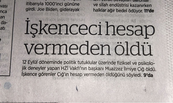 CHP yandaşı muhalif BirGün’ün haberine göre; geçtiğimiz gün ölen HZİ Vakfı’nın başkanı Muazzez İlmiye Çığ, 12 Eylül döneminde politik tutuklular üzerinde fiziksel ve psikolojik deneyler yaptı. Haberde Çığ’ın “işkence görenlere hesap vermeden öldüğü” ifade edildi.
