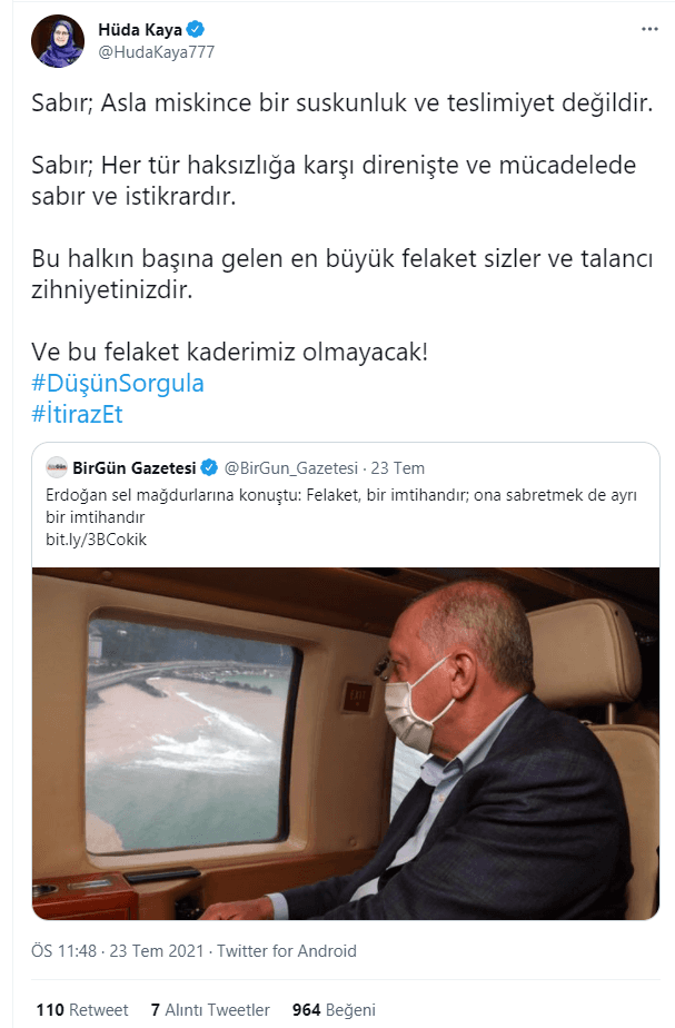 Terör sevici HDP'nin İstanbul Milletvekili Hüda Kaya, Cumhurbaşkanı Recep Tayyip Erdoğan'ın, Rize'deki sel felaketine ilişkin, afetzedelerle konuşmasında kullandığı, "Felaket, bir imtihandır; ona sabretmek de ayrı bir imtihandır." sözlerini hedef aldı. 28 Şubat sürecinde başörtüsü mücadelecesi olmakla övünen HDP'li Kaya, sel felaketinin Alllah'tan geldiğini göz ardı ederek iktidarı eleştirdi.