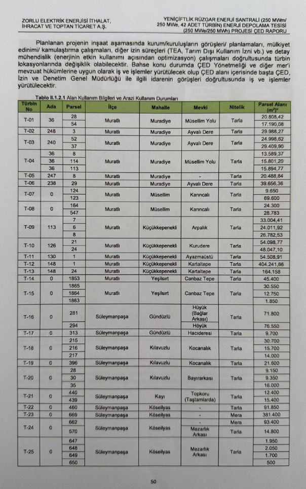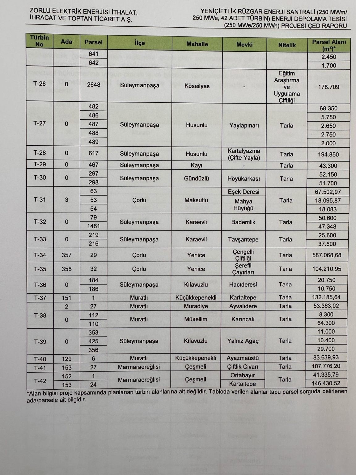 ÇED raporundaki tablolara göre sadece Muratlı’daki Muradiye, Ayvalıdere, Karnıcalı, Küçükpeçenekli gibi kırsal mahallelerde, her biri 20 bin ile 400 bin metrekare arasında değişen parseller türbin sahasına dönüştürülecek. Süleymanpaşa ilçesindeki Gündüzlü, Kılavuzlu, Kayı ve Köseilyas gibi bölgelerde de aynı şekilde büyük tarım arazileri türbinlerle dolacak.