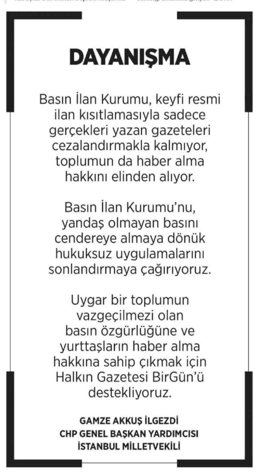 BirGün’ün aldığı cezanın ardından CHP, bugüne dek bir kez bile milletin yanında yer almamış olan gazeteye sahip çıktı. CHP’li Rezidans Kraliçesi Gamze Akkuş İlgezdi, BirGün için halkı sözde dayanışmaya çağırdı. BirGün’e ilan veren İlgezdi, “Uygar bir toplumun vazgeçilmezi olan basın özgürlüğüne ve yurttaşların haber alma hakkına sahip çıkmak için Halkın Gazetesi BirGün'ü destekliyoruz” ifadesini kullandı.