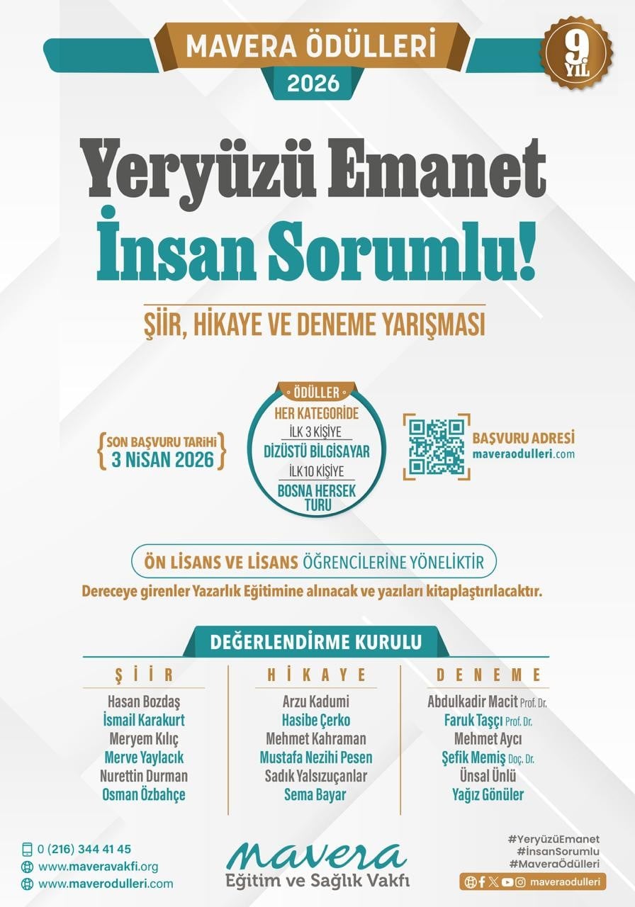 Mavera Eğitim ve Sağlık Vakfı’nın icra ettiği ve her sene ilginin giderek arttığı Mavera Ödülleri yarışma programının bu yıl 9.su düzenleniyor. Yeryüzü Emanet, İnsan Sorumlu! konulu, ödüllü şiir, hikaye ve deneme yarışması için başvurular başladı.