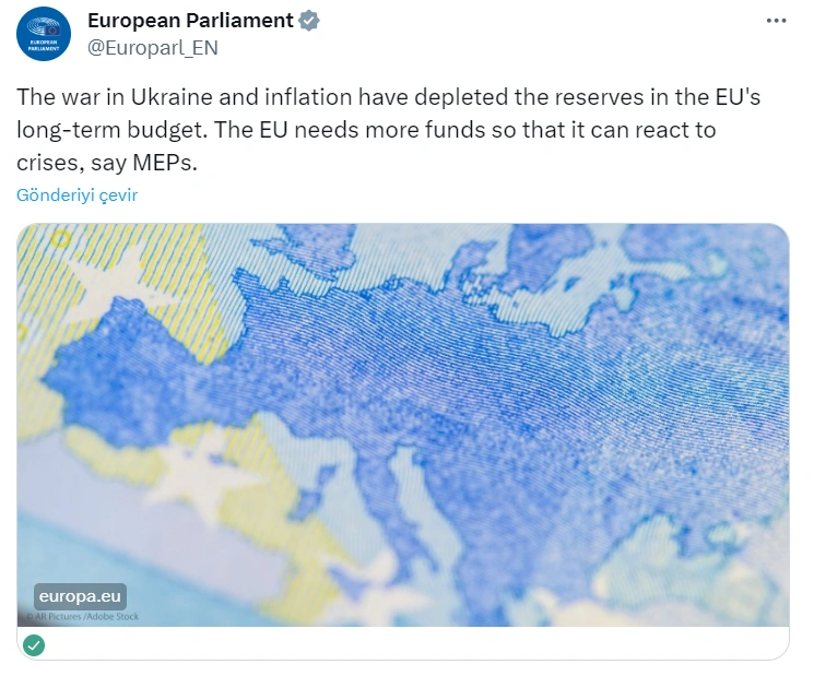 Avrupa Parlamentosu, resmi sosyal medya hesabı X'te (eski adıyla Twitter) yer alan açıklamasında, Ukrayna ihtilafının AB bütçesini tükettiğini itiraf etti.