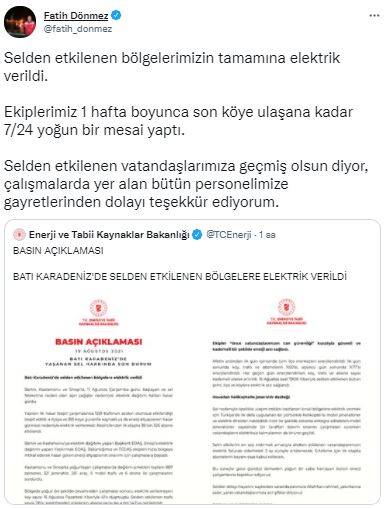 Sosyal medya hesabından açıklamada bulunan Enerji ve Tabii Kaynaklar Bakanı Fatih Dönmez, “Selden etkilenen bölgelerimizin tamamına elektrik verildi. Ekiplerimiz 1 hafta boyunca son köye ulaşana kadar 7/24 yoğun bir mesai yaptı. Selden etkilenen vatandaşlarımıza geçmiş olsun diyor, çalışmalarda yer alan bütün personelimize gayretlerinden dolayı teşekkür ediyorum” ifadelerini kullandı.
