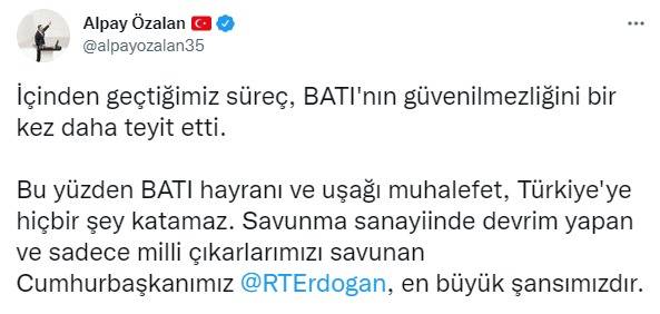 Özalan paylaşımında, “İçinden geçtiğimiz süreç, BATI'nın güvenilmezliğini bir kez daha teyit etti. Bu yüzden BATI hayranı ve uşağı muhalefet, Türkiye'ye hiçbir şey katamaz. Savunma sanayiinde devrim yapan ve sadece milli çıkarlarımızı savunan Cumhurbaşkanımız @RTErdogan, en büyük şansımızdır” dedi.