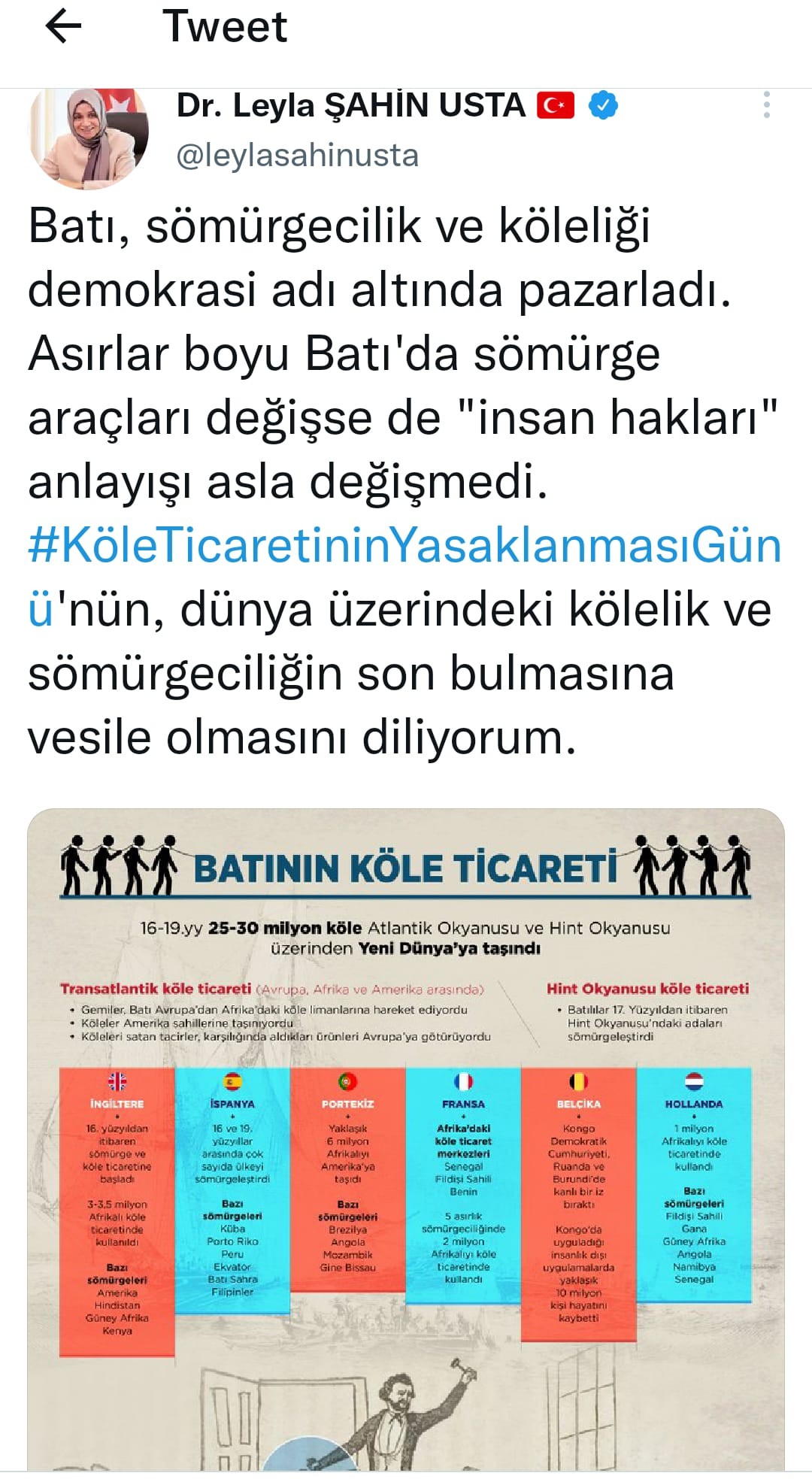 AK Parti Genel Başkan Yardımcısı Leyla Şahin Usta, "Batı, sömürgecilik ve köleliği demokrasi adı altında pazarladı. Asırlar boyu Batı'da sömürge araçları değişse de "insan hakları" anlayışı asla değişmedi. KöleTicaretininYasaklanmasıGünü'nün, dünya üzerindeki kölelik ve sömürgeciliğin son bulmasına vesile olmasını diliyorum" ifadelerini kullandı.