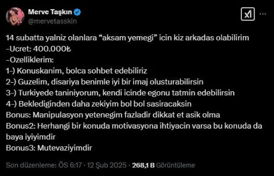 Taşkın paylaşımında kendisini arzu edenlerin 400 bin TL karşılığında "kız arkadaşı" olacağını söyledi. Ayrıca Taşkın, özelliklerini sıralayıp cinsiyetin fark etmediğini belirtti.
