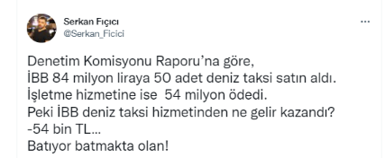 Twitter hesabından "Denetim Komisyonu Raporu" verilerini paylaşan Akşam yazarı Serkan Fıçıcı, İBB tarafından 84 milyon liraya 50 adet deniz taksi satın alındığını, hizmetten yalnızca 54 bin TL kazanıldığını aktardı.