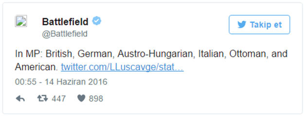 E3 2016 oyun fuarında resmen tanıtılan Battlefield 1'e dair yeni detaylar da gelmeye başladı. Oyunun resmi Twitter adresinden atılan tweet, özellikle Türkiye'deki hayranlarını oldukça sevindirecek cinsten.
