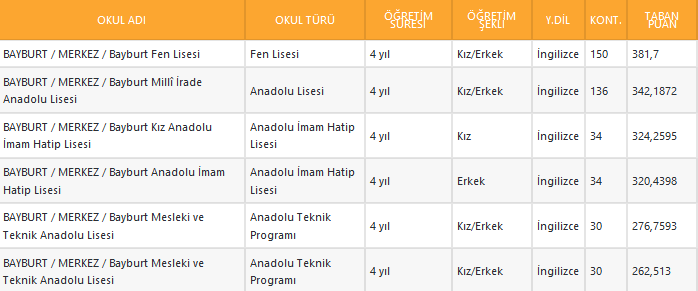 Bayburt liseleri taban puanı 2021, Bayburt liseleri başarı sıralaması ve liseleri kontenjanları nelerdir?