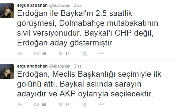 Millet gazetesi köşe yazarı Ergun Babahan, Deniz Baykal'ın Erdoğan'ın adayı olduğunu söyledi. Babahan, Twitter'dan şu ifadeleri kullandı: