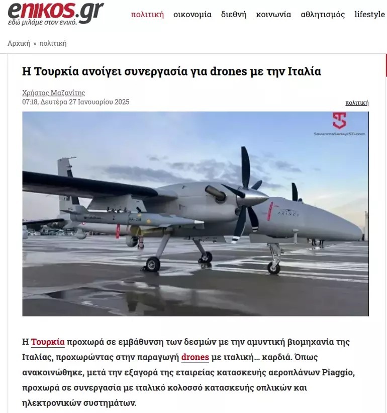 Öte yandan gazete Yunanistan'ın kendi SİHA programından da bahsetti. Enikos gazetesi Yunanistan'ın duyurduğu ARCHYTAS ve GRYPAS İHA projelerinin üzerinden neredeyse 4 yıl geçmesine karşın henüz bir adımın atılmadığını ve üretim tarihinin hala beklenildiğini yazdı.