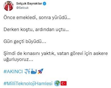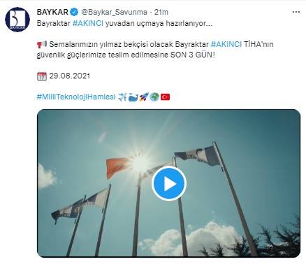Baykar'ın Twitter hesabından yapılan paylaşımda "Bayraktar #AKINCI yuvadan uçmaya hazırlanıyor... Semalarımızın yılmaz bekçisi olacak Bayraktar #AKINCI TİHA'nın güvenlik güçlerimize teslim edilmesine son 3 gün" ifadelerine yer verildi.