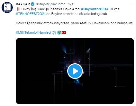 "Dikey İniş-Kalkışlı İnsansız Hava Aracı Bayraktar DİHA ilk kez TEKNOFEST2021'de Baykar standında sizlerle buluşacak. Geleceğe tanıklık etmek istiyorsan, yarın Atatürk Havalimanı'nda buluşalım"