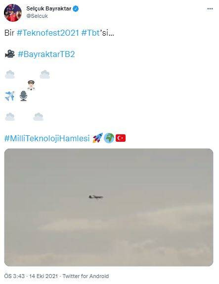 Bayraktar, "Bir #Teknofest2021 #Tbt’si…" notuyle videolu bir paylaşımda bulundu. Paylaşımında Bayraktar TB2 SİHA operatörünün sözlerine yer verdi. İşte o sözler...
