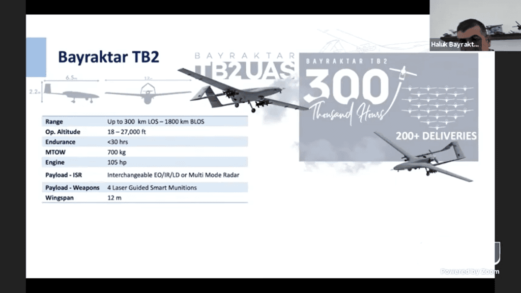Circle Foundation ve İngiltere Kraliyet Silahlı Kuvvetler Enstitüsünün (RUSI) 28 Mayıs 2021 tarihinde ortak etkinliğinden sunum yapan Haluk Bayraktar, Bayraktar TB2 S/İHA sisteminin güncellenen teknik özelliklerini paylaştı.