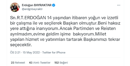 4 CHP'li isim, geçtiğimiz ay Cumhurbaşkanı Recep Tayyip Erdoğan'a, "reis" diye hitap edip, "Sayın Recep Tayyip Erdoğan 14 yaşından itibaren yoğun ve izzetli bir çalışma ile ve seçilerek Başkan olmuştur. Beni haksız yere attığına inanıyorum. Ancak partimden ve reisten ayrılmadım, evime geldim işime bakıyorum. Millet yapılan hizmet ve yatırımları tartarak Başkanımızı tekrar seçecektir." diyen Erdoğan Bayraktar'ın, sığırlarla yaptığı paylaşımına anlam yüklemeye çalıştı.