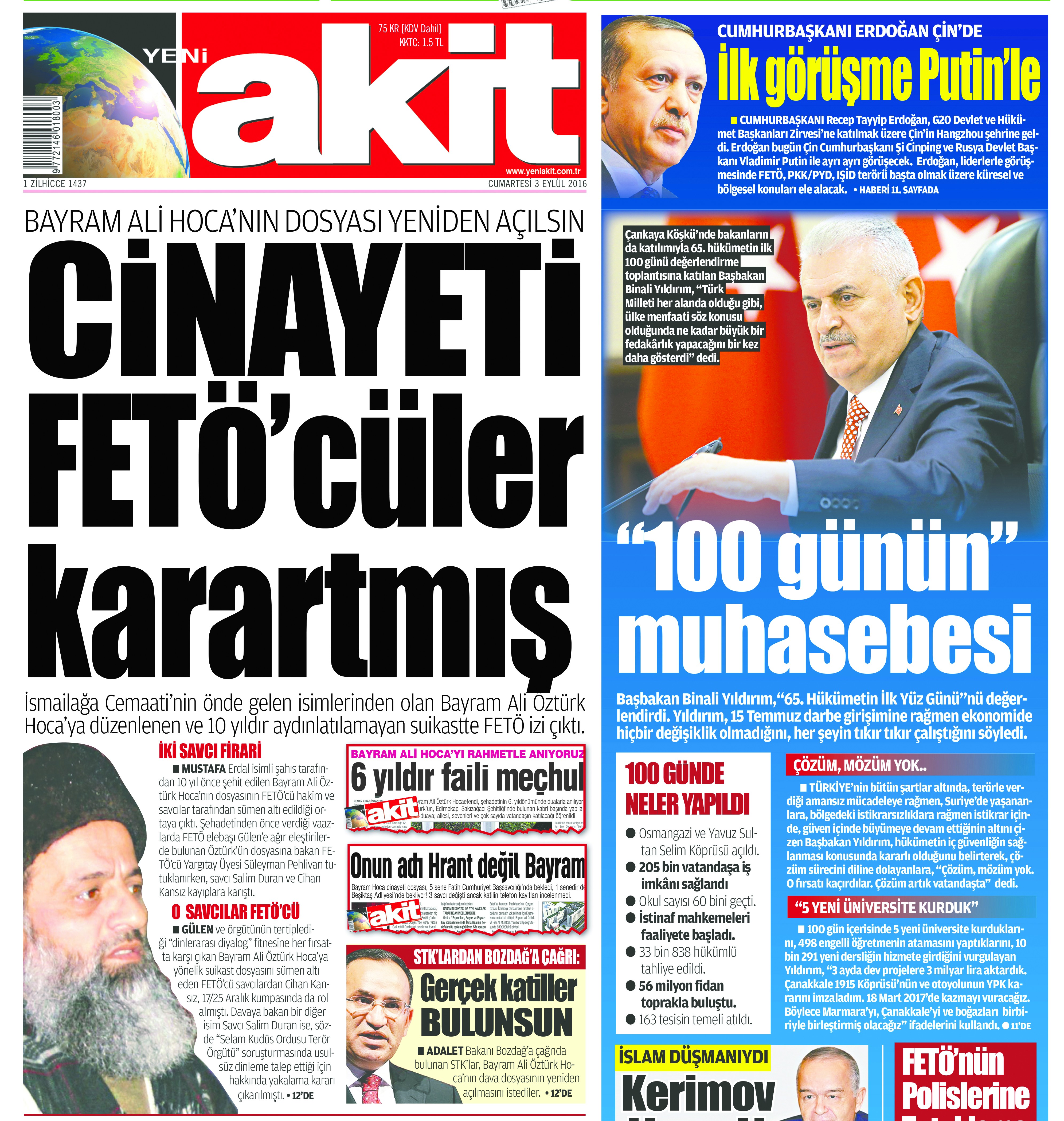 Akit, şehit Bayram Ali Hoca cinayeti dosyasının FETÖ’cü yargı mensupları tarafından sümen altı edildiğini ortaya çıkarmıştı. 3 Eylül 2016 tarihinde, “Cinayeti FETÖ’cüler karatmış” başlıklı haberinde konuyu gündeme taşıyan Akit, şu ifadelere yer vermişti: “FETÖ elebaşısı Fetullah Gülen ve örgütünün tertiplediği ‘Dinlerarası diyalog’ fitnesine karşı sert sözler sarf eden Bayram Hoca’nın dosyasına bakan hakim ve savcıların, FETÖ’nün 15 Temmuz’daki darbe teşebbüsü sonrası düzenlenen operasyonlar kapsamında tutuklanan Yargıtay Üyesi Süleyman Pehlivan, hakkında yakalama kararı çıkarılan Savcı Salim Duran ve firari Savcı Cihan Kansız olduğu tespit edildi.”