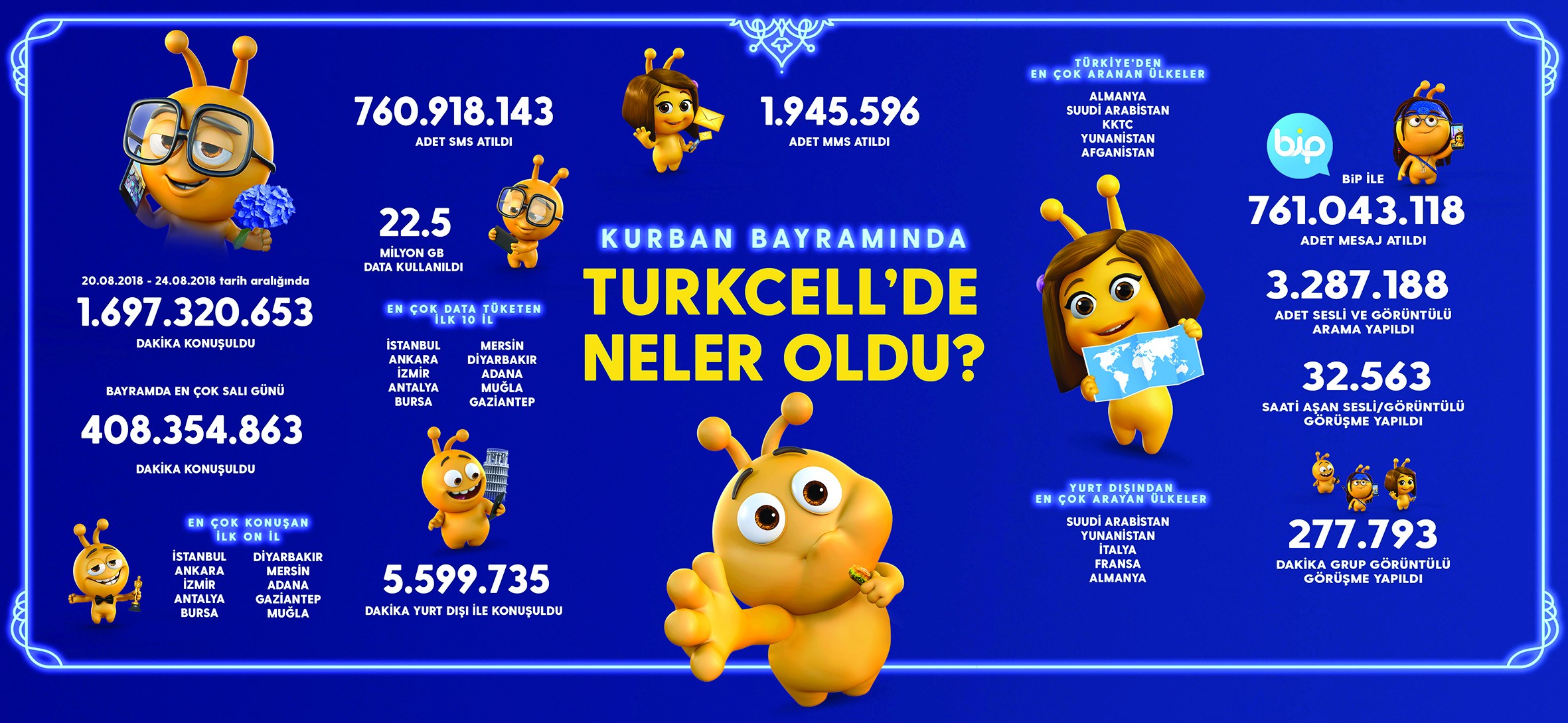 5 yıl önceki Kurban Bayramı’na göre internet trafiği 19 kat artış gösterdi. 2013 yılının Kurban Bayramı’nda kullanım 1,2 milyon GB’tı. En fazla data kullanımının yapıldığı ilk 10 il ise sırasıyla İstanbul, İzmir, Antalya, Ankara, Muğla, Bursa, Mersin, Balıkesir, Hatay ve Kocaeli oldu. Bayramda Turkcell’liler 1,7 milyar dakika konuştu. En fazla konuşma bayramın birinci günü gerçekleşti. Turkcell’liler bayramın birinci gününde 408 milyon dakika konuştu. Konuşma trafiğinin en fazla yaşandığı il İstanbul oldu. Bayramda en çok konuşan 10 il sıralamasında İstanbul’u Ankara, İzmir, Antalya, Bursa, Mersin, Diyarbakır, Adana, Muğla ve Gaziantep takip etti.