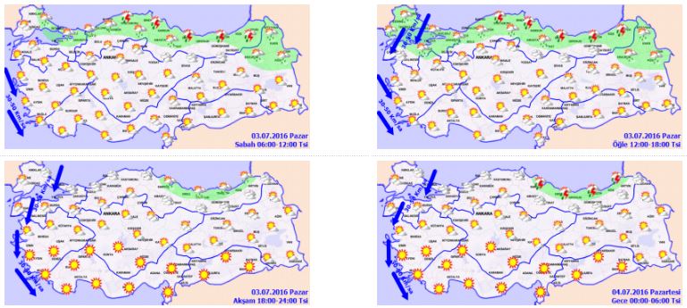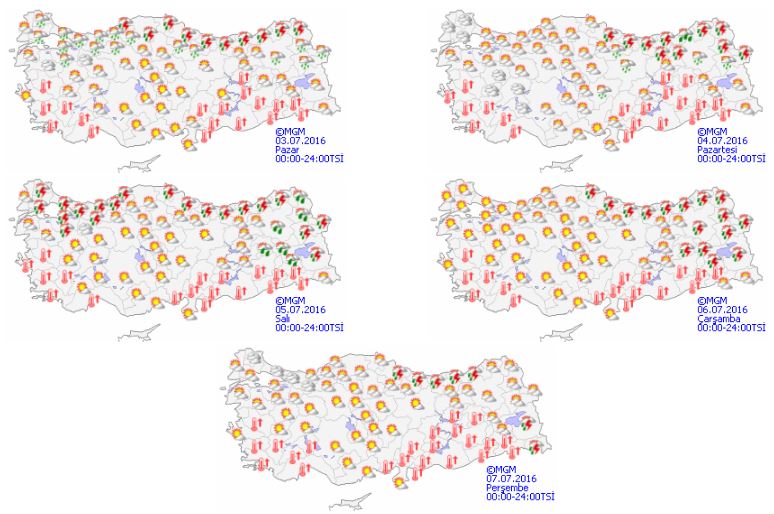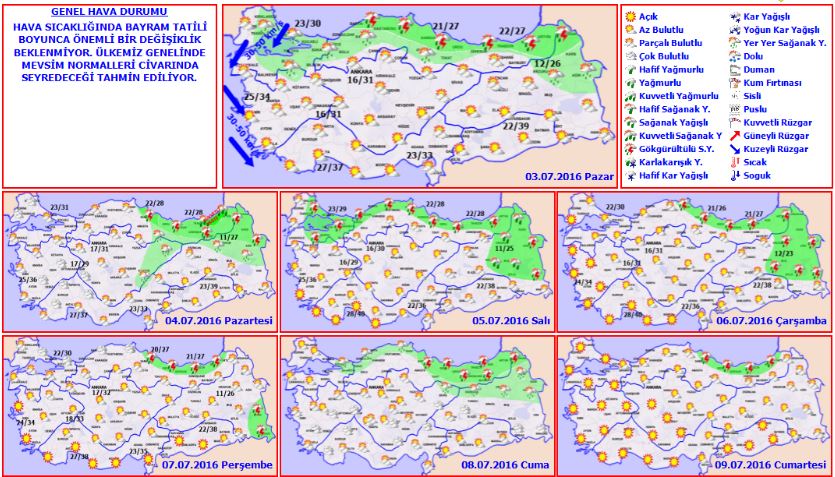 Ülkemizin kuzey, iç ve doğu kesimlerinin parçalı ve yer yer çok bulutlu, Orta ve Doğu Karadeniz, Doğu Anadolu’nun kuzeydoğusu ile İç Anadolu'nun kuzeydoğu kesimlerinin sağanak ve gök gürültülü sağanak yağışlı, diğer yerlerin az bulutlu ve açık geçeceği, yağışların Doğu Karadeniz kıyılarının doğusunda kuvvetli olacağı tahmin ediliyor.