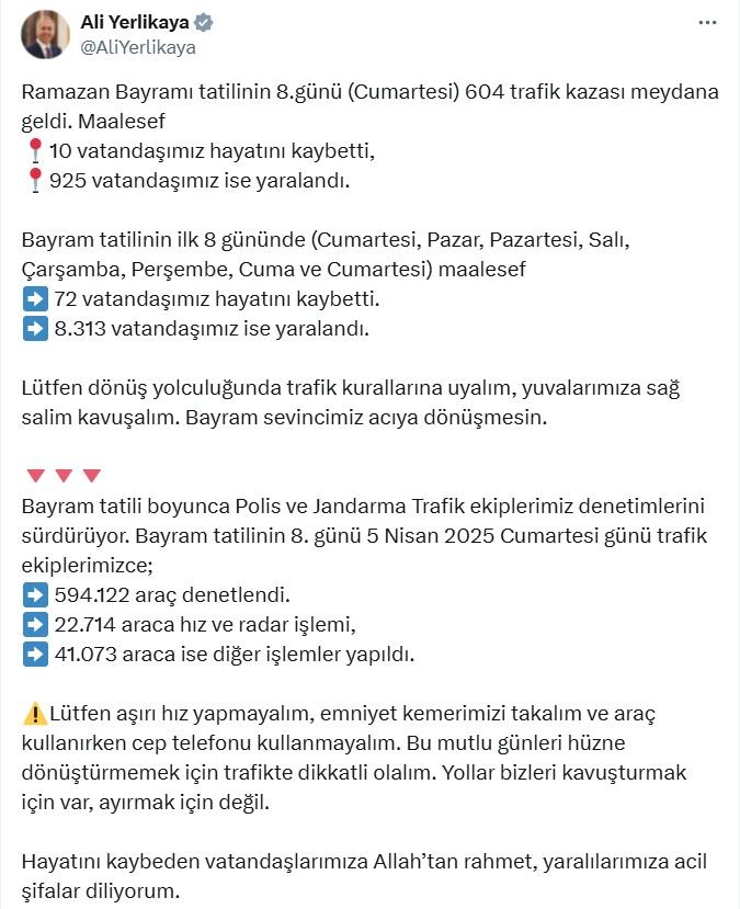 Yerlikaya, denetimlerin devam ettiğini belirterek, "Lütfen dönüş yolculuğunda trafik kurallarına uyalım, yuvalarımıza sağ salim kavuşalım. Bayram sevincimiz acıya dönüşmesin. Bayram tatili boyunca polis ve jandarma trafik ekiplerimiz denetimlerini sürdürüyor. Bayram tatilinin 8'inci günü 5 Nisan 2025 Cumartesi günü trafik ekiplerimizce; 594 bin 122 araç denetlendi. 22 bin 714 araca hız ve radar işlemi, 41 bin 73 araca ise diğer işlemler yapıldı. Lütfen aşırı hız yapmayalım, emniyet kemerimizi takalım ve araç kullanırken cep telefonu kullanmayalım. Bu mutlu günleri hüzne dönüştürmemek için trafikte dikkatli olalım. Yollar bizleri kavuşturmak için var, ayırmak için değil. Hayatını kaybeden vatandaşlarımıza Allah'tan rahmet, yaralılarımıza acil şifalar diliyorum" dedi.