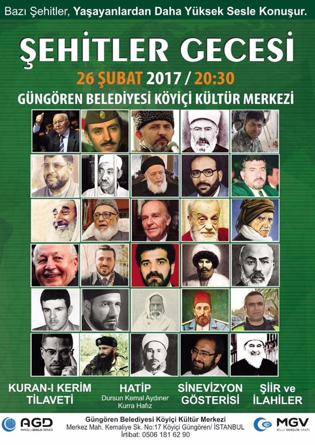 Anadolu Gençlik ve Derneği ve Milli Gençlik Vakfı öncülüğünde Güngören Belediyesi Köyiçi Kültür Merkezi'nde 26 Şubat Pazar günü saat 20.30'da ‘Bazı şehitler, yaşayanlardan daha yüksek sesle konuşur’ sloganıyla ‘Şehitler Gecesi’ düzenlenecek. Gecede aralarında Merhum Necmettin Erbakan Hoca, Sultan 2. Abdülhamid Han, Necip Fazıl Kısakürek ve 15 Temmuz şehidi Ömer Halisdemir gibi hayatını bu topraklara adamış birçok isim anılacak. Kur'an-ı Kerim tilavetiyle başlayacak olan ‘Şehitler Gecesi’ şiir ve ilahiler ile son bulacak.