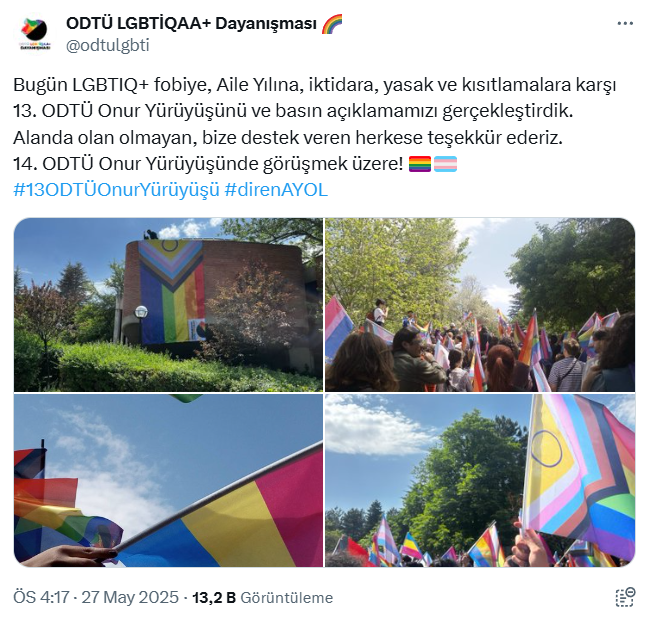 Her yıl sapkın yürüyüşü organize edenlerin oluşturduğu “ODTÜ LGBTİQAA+ Dayanışması” isimli hesaptan, “LGBTIQ+ fobiye, Aile Yılına, iktidara, yasak ve kısıtlamalara karşı 13. ODTÜ Onur Yürüyüşünü ve basın açıklamamızı gerçekleştirdik. Alanda olan olmayan, bize destek veren herkese teşekkür ederiz. 14. ODTÜ Onur Yürüyüşünde görüşmek üzere!” denilerek rezilliğin gelecek yıl da tekrarlanacağı duyuruldu.