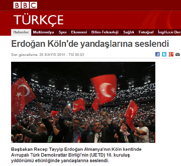 BBC'nin internet sitesi, Başbakan Erdoğan'ın yaptığı konuşmayı "Erdoğan Köln'de yandaşlarına seslendi" başlığıyla duyurdu.