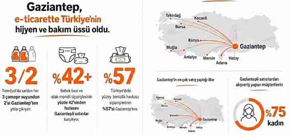 Trendyol’un güncel verilerine göre; tekstilden bebek bakımına, kişisel bakımdan yapı markete kadar uzanan geniş bir ürün çeşitliliğine sahip olan Gaziantep, özellikle temizlik ve bebek ürünleri kategorilerinde Türkiye genelindeki siparişlerin çok büyük bir kısmını karşılıyor. Türkiye genelinde Trendyol üzerinden satılan her 3 çamaşır suyundan 2’si Gaziantep’ten yola çıkarken, bebek bezi ve ıslak mendil siparişlerinin yüzde 42’sinden fazlasını da yine Gaziantepli satıcılar karşılıyor.